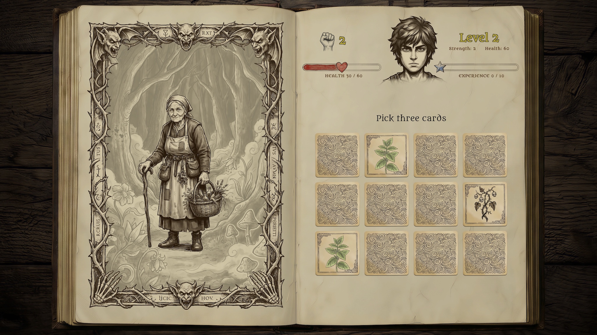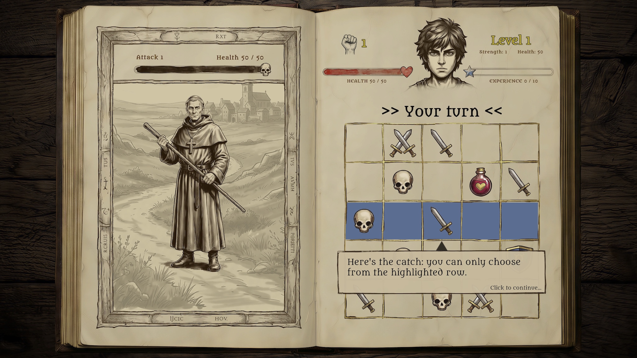 - Simple, readable actions with meaningful consequences (strike, defend, risk heavier hits, and unleash dark effects)