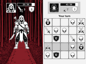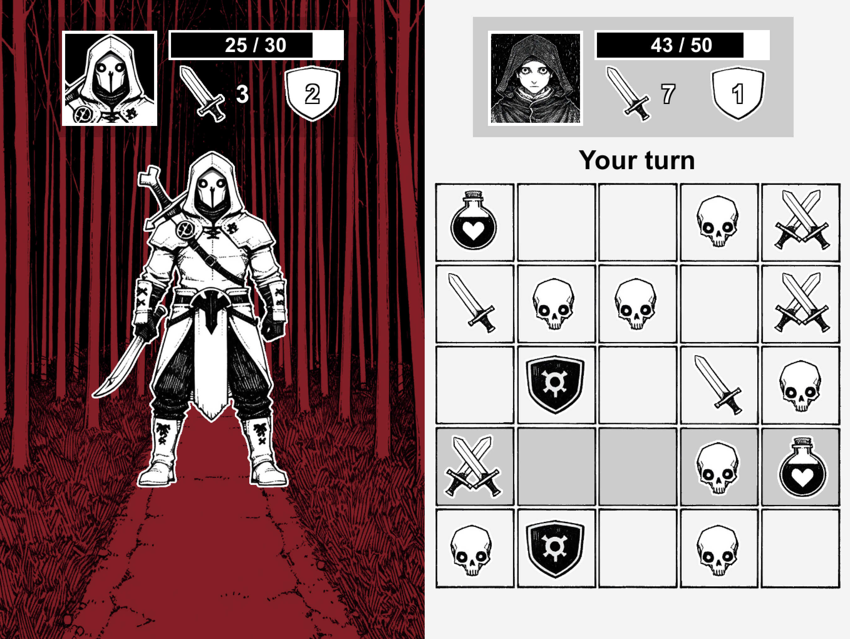 - On your turn you select one tile; that tile’s icon determines the effect (attack, defend, heal, curse…).